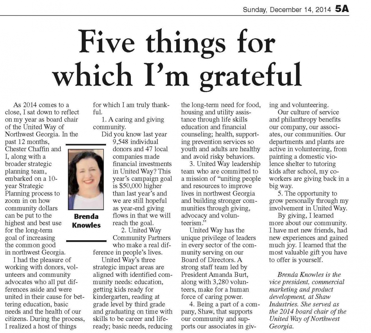 12/14/14: Five things for which I'm grateful for (Guest post by Brenda Knowles)